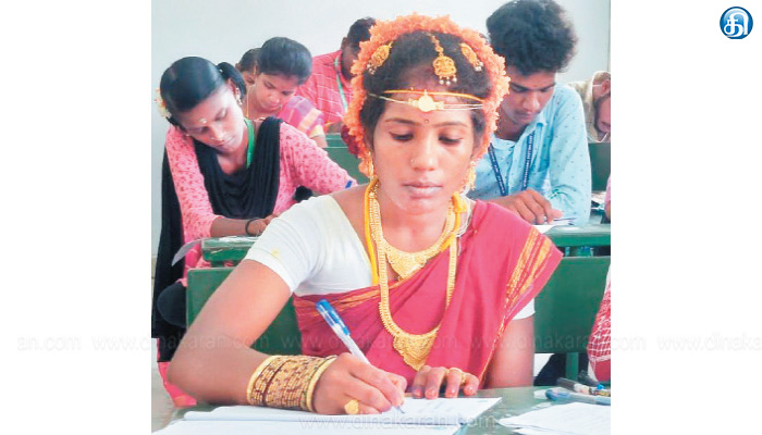 அரசு கலைக் கல்லூரியில் மணக்கோலத்தில் தேர்வு எழுதிய மாணவி