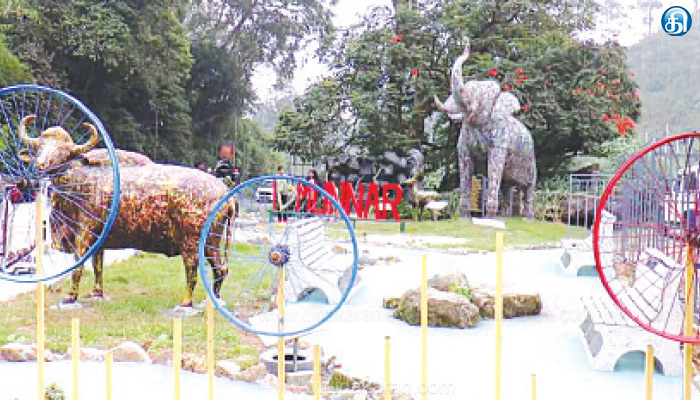 மூணாறு: மூணாறில் பிளாஸ்டிக் கழிவுகளால் உருவாக்கப்பட்ட ‘அப்சைக்கிள்’ பூங்கா, சுற்றுலாப் பயணிகளை வெகுவாக கவர்ந்து வருகிறது. கேரள மாநிலம், இடுக்கி மாவட்டத்தில் உள்ள மூணாறில், கொச்சி-தனுஷ்கோடி தேசிய சாலை அருகே, பழைய மூணாறில் ‘பிளாஸ்டிக் மூணாறு பஞ்சாயத்து’ தலைமையில் அப் சைக்கிள் பூங்கா அமைக்கப்பட்டுள்ளது. இது சுற்றுலாப் பயணிகள் சாலையோரங்களில் தூக்கி வீசும் பிளாஸ்டிக் பாட்டில்கள், வாகனங்களின் வீணான உதிரி பாகங்கள், பழைய பிளாஸ்டிக் டயர்கள் மற்றும் எலக்ட்ரானிக் கழிவுகளை ஆகியவற்றை உபயோகித்து அழகிய பூங்கா உருவாக்கப்பட்டுள்ளது. பழைய மூணாறு சந்திப்பில் அமைந்துள்ள இந்த பூங்காவிற்கு ‘அப்சைக்கிள் பார்க்’ என்று பெயரிடப்பட்டுள்ளது. பூங்காவில் பழைய டயர்களால் வடிவமைக்கப்பட்ட நடைபாதை, 30 கிலோ எடையுள்ள பிளாஸ்டிக் கழிவுகளால் உருவாக்கப்பட்ட இருக்கைகள், பிளாஸ்டிக் பாட்டில் கழிவுகளால் உருவாக்கப்பட்ட யானையின் மிகப்பெரிய சிலை, மான், வரையாடு, தவளைகள் மற்றும் நீரில் வாழக்கூடிய உயிரினங்கள் வாழ்வதற்கேற்ப தண்ணீர் தொட்டிகள், மூணாறில் மட்டுமே காணப்படும் அரிய வகை தாவரங்களின் செடிகள் மற்றும் பிளாஸ்டிக் கழிவுகளை கொண்டு செய்யப்பட்ட பெரிய பூக்கள் ஆகியவை அமைக்கப்பட்டுள்ளன.