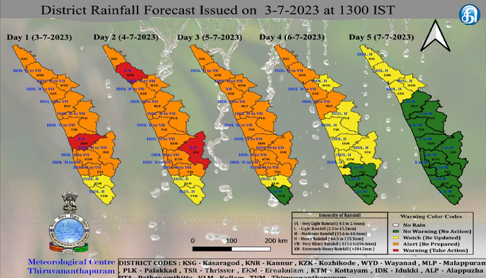 வங்கக்கடலில் உருவாகியுள்ள புயல் சுழற்சி மற்றும் கேரள-குஜராத் கடற்கரையில் குறைந்த காற்றழுத்த தாழ்வு நிலை காரணமாக பருவமழை தீவிரமடைய வாய்ப்புள்ளது. தெற்கு மகாராஷ்டிரா கடற்கரையில் இருந்து கேரள கடற்கரை வரை கடலோர காற்றழுத்த தாழ்வு பகுதி நிலவி வருகிறது. புயல் மேற்கு வங்காள விரிகுடாவின் மையத்திலும் மற்றொரு புயல் அந்தமான் கடலிலும் நிலை கொண்டுள்ளது. இதன் காரணமாக கேரளாவில் அடுத்த 5 நாட்களுக்கு பரவலாக மழையும், ஓரிரு இடங்களில் கனமழையும், ஜூலை 4 மற்றும் 5ம் தேதிகளில் சில இடங்களில் கனமழையும் பெய்ய வாய்ப்புள்ளதாக மத்திய வானிலை ஆய்வு மையம் தெரிவித்துள்ளது.
