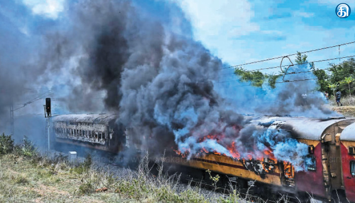 இதனை கவனித்த பயணிகள் அலறி கூச்சலிட்டனர். அதற்குள் குபுகுபுவென புகை வந்து தீப்பிடித்தது. பின்னர் உடனடியாக அபாய சங்கிலியை இழுத்து ரயிலை நிறுத்தினர். பயணிகள் அலறியடித்தபடி ஒருவர் மீது ஒருவர் விழுந்தடித்துக்கொண்டு ரயிலில் இருந்து இறங்கி ஓட்டம் பிடித்தனர். இதில் முதியோர் மற்றும் குழந்தைகளை வைத்திருந்தோர் ரயிலை விட்டு வேகமாக இறங்குவதற்கு கடும் அவதிப்பட்டு, கதறியபடி இறங்கியதால் அங்கு பெரும் பரபரப்பு ஏற்பட்டது. அதற்குள் தீப்பிடித்து 6 ரயில் பெட்டிகள் மளமளவென எரியத் தொடங்கியது. காற்றின் வேகம் அதிகரித்ததால் தீ வேகமாக பரவி எஸ்3, எஸ்4, எஸ்5, எஸ்6 என நான்கு பெட்டிகள் முற்றிலும் எரிந்து சாம்பலானது. பயணிகள் அனைவரும் உயிர் பயத்தில் தங்களது உடமைகளை ரயிலில் இருந்து எடுக்கதாதால் அவை ரயில் பெட்டிகளிலேயே கருகியது.