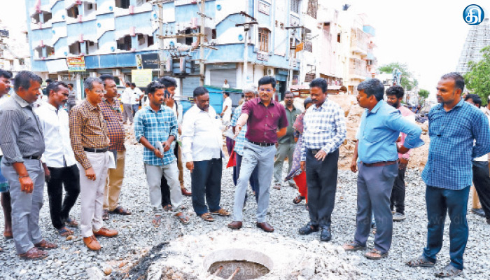 திருவண்ணாமலை: திருவண்ணாமலை அண்ணாமலையார் கோயில் மாட வீதியை கான்கிரீட் சாலையாக தரம் உயர்த்தும் பணியை கலெக்டர் முருகேஷ் நேரில் ஆய்வு செய்தார். அப்போது பணிகளை விரைந்து முடிக்க நடவடிக்கை மேற்கொண்டார். உலக பிரசித்தி பெற்ற ஆன்மிக நகரான திருவண்ணாமலையில், அண்ணாமலையார் கோயில் தேரோடும் மாட வீதியை கான்கிரீட் சாலையாக தரம் உயர்த்தும் பணி, சாலை உள்கட்டமைப்பு மேம்பாட்டு திட்டத்தின் கீழ் சுமார் ரூ.20 கோடி மதிப்பில் நடந்து வருகிறது. அதையொட்டி, மாட வீதியின் இருபுறமும் நிரந்தர வடிகால் வசதிகள் அமைத்தல், மின் கம்பங்களை மாற்றும் பணிகள் நடந்து வருகின்றன. மேலும், மாட வீதியில் உள்ள மின் கம்பிகளை எல்லாம் புதைவட மின்வழித்தடமாக மாற்ற ரூ.5 கோடி நிதியும், நகராட்சி குடிநீர் இணைப்புகளை எல்லாம் மாற்றி அமைக்க ரூ.3.47 கோடி நிதி ஒதுக்கப்பட்டுள்ளது. அதன்தொடர்ச்சியாக, அதி நவீன தரத்தில் கான்கிரீட் சாலை அமைக்கும் பணி முதற்கட்டமாக பே கோபுர சாலையில் திரவுபதி அம்மன் கோயில் தொடங்கி, சங்கு மேடு பகுதி வரை முழு வீச்சில் நடந்து வருகிறது. அதையொட்டி, ஏற்கனவே இருந்த தார் சாலையை முற்றிலும் அகற்றிவிட்டு, சுமார் 3 அடி ஆழம் வரை பள்ளம் எடுத்து கான்கிரீட் சாலை அமைக்கப்படுகிறது.