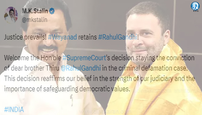 இந்நிலையில் ராகுல் காந்தி வழக்கில் நீதி வென்றது என முதலமைச்சர் மு.க.ஸ்டாலின் தனது டிவிட்டர் பக்கத்தில் பதிவிட்டுள்ளார். இதுகுறித்து முதல்வர் வெளியிட்டுள்ள ட்விட்டர் பதிவில், அவதூறு வழக்கில் ராகுல் காந்திக்கு தண்டனையை நிறுத்தி வைத்த உச்சநீதிமன்ற தீர்ப்பை வரவேற்கிறோம். நீதித்துறையின் வலிமை மற்றும் ஜனநாயக விழுமியங்கள் மீதான நம்பிக்கையை மீண்டும் உச்சநீதிமன்றத்தின் தீர்ப்பு உறுதிப்படுத்தி உள்ளது. ராகுல்காந்தி வழக்கில் நீதி வென்றுள்ளது; சகோதரர் ராகுல் காந்தியை வயநாடு தொகுதி மீண்டும் தக்க வைத்துக் கொண்டுள்ளது என்று குறிப்பிட்டுள்ளார்.
