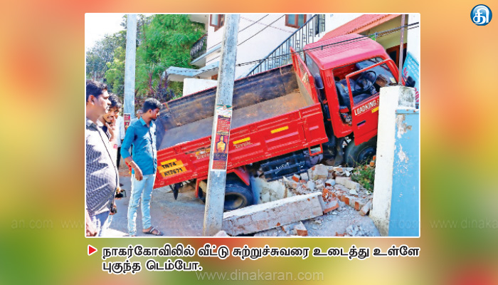நாகர்கோவில் : நாகர்கோவிலில் தாறுமாறாக ஓடி வீட்டு சுற்றுச்சுவரை உடைத்து உள்ளே டெம்போ புகுந்ததால் பரபரப்பு ஏற்பட்டது. நாகர்கோவிலில் நகருக்குள் பைக்குகள் மட்டுமின்றி டாரஸ் லாரிகள், டெம்போக்களும் அதிவேகத்தில் செல்கின்றன. இதனால், அடிக்கடி விபத்துகள் ஏற்பட்டு வருகிறது. நேற்று காலை வெட்டூர்ணிமடம் கிறிஸ்துநகர் சாலையில் பால்பண்ணை சந்திப்பில் இருந்து, வெட்டூர்ணிமடத்திற்கு டெம்போ ஒன்று வேகமாக வந்தது.