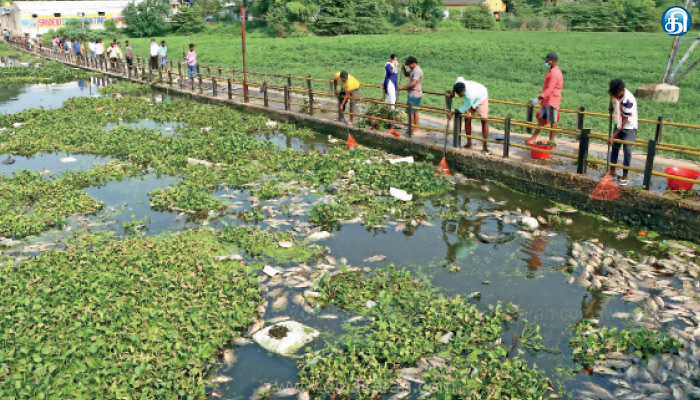 ஒவ்வொரு மீனும் அரை கிலோ முதல் ஒரு கிலோ எடை இருந்தது. மேலும் செடிகளுக்கு மத்தியில் மீன்கள் அதிகளவில் செத்து மிதப்பதால் செடிகளை அப்புறப்படுத்திவிட்டு மீன்களை அகற்றும் பணியில் நகராட்சி ஊழியர்கள் ஈடுபட்டு வருகின்றனர். கூவத்தில் மர்ம நபர்கள் இரவு நேரங்களில் குப்பை மற்றும் கழிவுநீரைவிட்டு செல்வதாகவும், தனியார் நிறுவனங்களின் ரசாயனங்கள் கூவத்தில் கலப்பதால் மீன்கள் செத்துமிதப்பதாக மக்கள் குற்றம்சாட்டுகின்றனர். இதுகுறித்து நகராட்சி அதிகாரிகளிடம் கேட்டபோது, வெயிலின் தாக்கம் மற்றும் நீருக்கு அடியில் ஆக்ஸிஜன் அளவு குறைந்தால் மீன்கள் செத்திருக்கலாம். நச்சு கலந்த நீரால் மீன்கள் இறந்ததா? என்பதை அறிய மீன்களை ஆய்வுக்கு அனுப்பியுள்ளோம். தனியார் நிறுவனங்களில் இருந்து ரசாயனம் கலந்த கழிவுநீர் கூவத்தில் கலக்கப்படுகிறதா என்பது குறித்து ஆய்வு செய்து வருவதாக அதிகாரிகள் தெரிவித்தனர்.