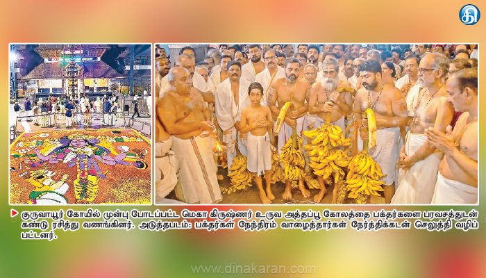 பாலக்காடு : ஓணம் திருவிழாவையொட்டி குருவாயூர் கோயில் முன்பு மெகா கிருஷ்ணர் உருவ அத்தப்பூக்கோலம் பக்தர்களை பரவசப்படுத்தியது. நேந்திரம் வாழைத்தார் வழங்கி நேர்த்திக்கடன் செலுத்தினர்.கேரள மாநிலம் குருவாயூர் கோயிலில் ஓணம் திருவிழாவின் முதல் நாளான உத்தராடம் நட்சத்திர நாளில் பக்தர்கள் நேந்திரம் வாழைத்தார்கள் நேர்த்திக்கடன் செலுத்தி வழிபட்டனர்.