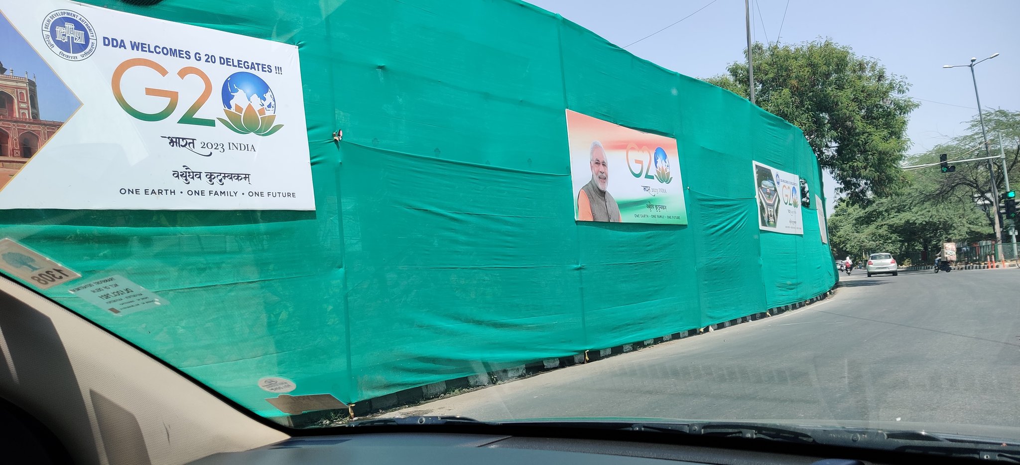 வசந்த் விகாரில் உள்ள குடிசை பகுதி பச்சை நிற ராட்சத திரைசீலைகளை கொண்டு மறைக்கப்பட்டுள்ளன. அதன் நடுவே பிரதமர் மோடியின் உருவப்படம் பொரித்த ஜீ 0 பேனர்களும் வைக்கப்பட்டுள்ளன. முன்னதாக டிஎன்டி பாலத்திற்கு அருகே உள்ள செக்டர் 16 சாலையோரத்தில் குடிசை பகுதிகளை அரசு அதிகாரிகள் வெள்ளைநிற திரைசீலைகளை கொண்டு மறைத்திருந்தனர். இதனால் தங்கள் வாழ்வாதாரம் பாதிக்கப்படுவதாகவும், அவர்கள் குற்றம் சாட்டியிருந்தனர். சர்வதேச தலைவர்கள் இந்தியா வரும் போது அவர்களது கண்களுக்கு குடிசை தெரியாமல் இருப்பதற்காக திரைசீலையை கொண்டு மறைப்பது இது முதல்முறை அல்ல.