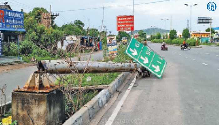 தனியார் பேருந்துகள், கனரக வாகனங்கள் ஏராளமாக இவ்வழியாக செல்லும். கீழே விழுந்து கிடக்கும் வழிகாட்டி பெயர் பலகையை அகற்றாமல் இருப்பதால் விபத்துக்கள் ஏற்பட அதிக வாய்ப்புகள் உள்ளது. இதனால், பொதுமக்களும், வாகன ஓட்டிகளும் பெரும் சிரமத்திற்க்குள்ளாகியுள்ளனர்.