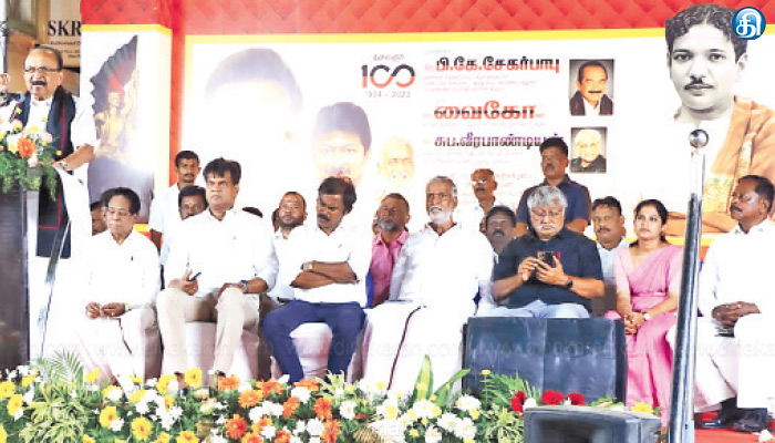 சென்னை கிழக்கு மாவட்ட செயலாளரும் இந்து சமய அறநிலையத்துறை அமைச்சர் பி.கே.சேகர்பாபு, மேயர் பிரியா, கலாநிதி வீராசாமி எம்பி, தாயகம் கவி எம்எல்ஏ, இளைஞர் அணி அமைப்பாளர் லோகேஷ், துலுக்காணம் உள்ளிட்ட கலந்து கொண்டனர். இந்த பொதுக்கூட்டத்தில் வைகோ பேசியதாவது; சந்திரகுப்தர், மௌரியர் என இந்திய வட பகுதிகளில் ஆட்சி செய்தவர்கள் ஒருபோதும் தமிழ்நாட்டில் கால் வைத்ததில்லை. ஆனால் தமிழ்நாடு அரசர்கள் கங்கை வரை சென்று ஆட்சி செய்துள்ளனர். மலேசியா, தாய்லாந்து என்று வெளி நாடுகளை கைப்பற்றி ஆட்சி செய்தவர்கள் சேர, சோழ, பாண்டியர்கள். பாரதம் என சனாதனத்தை நிலை நிறுத்தினால், இந்தியா துண்டு, துண்டாக போய் விடும் என்பதை தற்போது உள்ள ஆட்சியாளர்கள் தெரிந்து கொள்ளவேண்டும்.