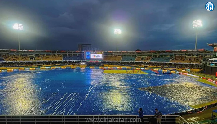அப்போது இந்திய அணி 24.1 ஓவர்களில் 2 விக்கெட்டுகள் இழப்பிற்கு 147 ரன்கள் சேர்த்திருந்த நிலையில், திடீரென மழை பெய்ய தொடங்கியது. 4.55 மணிக்கு மழை பெய்ய தொடங்கிய நிலையில், உடனடியாக மைதானத்தின் மூடப்பட்டது.