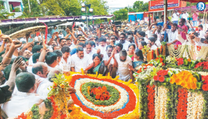 அவருடன் அமைச்சர்கள் தங்கம் தென்னரசு, பி.மூர்த்தி, பெரியகருப்பன், ராஜ கண்ணப்பன், கயல்விழி செல்வராஜ், தமிழக அரசின் டெல்லி பிரதிநிதி ஏ.கே.எஸ் விஜயன், மாவட்ட செயலாளர் காதர்பாட்சா முத்துராமலிங்கம், எம்.எல்.ஏக்கள் பரமக்குடி முருகேசன், மானாமதுரை தமிழரசி உள்ளிட்ட பலரும் மரியாதை செலுத்தினர். அதிமுக சார்பில் முன்னாள் அமைச்சர் ஆர்.பி.உதயகுமார், ஜார்க்கண்ட் மாநில கவர்னர் சி.பி.ராதாகிருஷ்ணன், தமிழ்நாடு பாஜ தலைவர் அண்ணாமலை, அமமுக பொதுச்செயலாளர் டி.டி.வி தினகரன், மதிமுக சார்பில் வாசுதேவநல்லூர் எம்.எல்.ஏ சதன் திருமலைக்குமார் மற்றும் காங்கிரஸ், விடுதலை சிறுத்தைகள் கட்சி நிர்வாகிகள் உள்ளிட்ட பலரும் மலர்வளையம் வைத்து மரியாதை செலுத்தினர்.