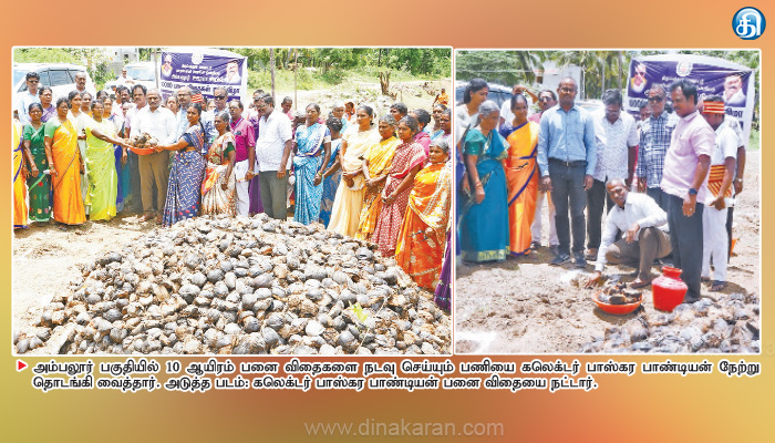 அதன்படி நேற்று அதற்கான பணிகள் துவக்கப்பட்டது. இந்த பணியை கலெக்டர் பாஸ்கர பாண்டியன் கலந்து கொண்டு 10 ஆயிரம் பனை விதைகளை நடவு செய்யும் பணிகளை துவக்கி வைத்தார். இந்த நிகழ்ச்சியில் ஊரக வளர்ச்சி முகமை திட்ட இயக்குனர் செல்வராசு, அம்பலூர் ஊராட்சி மன்ற தலைவர் முருகேசன் உட்பட உள்ளாட்சி பிரதிநிதிகள் மற்றும் பொதுமக்கள் என ஏராளமானோர் கலந்து கொண்டனர்.