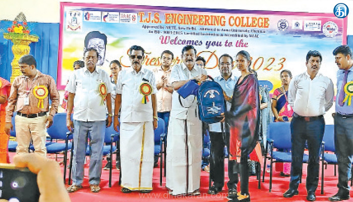 மேலும், சிறப்புரை ஆற்றிய பேச்சாளர் அருள் பிரகாஷ் பேசும்போது, கல்லூரியில் சேர்ந்து படிக்கும் மாணவர்கள் தாழ்வு மனப்பான்மையை களைந்து, அவர்கள் படிக்கும் துறையில் சிறந்தவர்களாக திகழ, துவக்கம் முதலே முனைப்போடு கற்க வேண்டும், பொறியியல் படிப்பு எப்போதும் தோற்ககூடாது, பொறியியல் கல்வி கற்பவர்கள் அறிவை பட்டை தீட்டி புதிய கண்டுபிடிப்பவர்களாய் இருக்க வேண்டும் என பேசினார். நிகழ்வின் முடிவில், முதலாண்டு மாணவர்களுக்கு புத்தக பை, கல்வி உபகரணங்களை டி.ஜெ.கோவிந்தராஜன் எம்எல்ஏ வழங்கினார்.