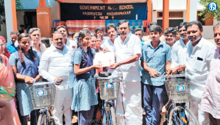 ஒன்றியக்குழு தலைவர் சிவக்குமார் தலைமை தாங்கினார். பொதுக்குழு உறுப்பினர்கள் குணசேகரன், மாவட்ட கவுன்சிலர் ராமஜெயம், சாரதாம்மா முத்துசாமி, தலைமை ஆசிரியர் தனஞ்செயன், ஊராட்சி மன்ற தலைவர்கள் லாரன்ஸ், மூர்த்தி, சீனிவாசன், ஒன்றிய கவுன்சிலர்கள் சிட்டிபாபு, ஆரோக்கிய மேரி, பள்ளி மேலாண்மைக்குழு தலைவர் லாவண்யா, மோகன் பாபு, போந்தவாக்கம் நாகராஜ், வடிவேலு ஆகியோர் முன்னிலை வகித்தனர். இதனைத் தொடர்ந்து, சிறப்பு விருந்தினராக பங்கேற்ற கும்மிடிப்பூண்டி எம்எல்ஏ டி.ஜெ. கோவிந்தராஜன் கலந்துகொண்டு மாணவ, மாணவிகளுக்கு சைக்கிளை வழங்கினார். முடிவில் துணை தலைமை ஆசிரியர் அகஸ்டின் ஏசுராஜ் நன்றியுரை நிகழ்த்தினார்.