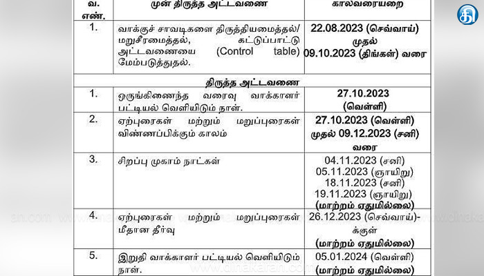 சென்னை: தமிழக தலைமை தேர்தல் அதிகாரி நேற்று வெளியிட்டுள்ள அறிக்கை: இந்திய தேர்தல் ஆணையம் கடந்த மே மாதம் 29ம் தேதி 2024 ஜனவரி 1ம் தேதி தகுதியேற்படுத்தும் நாளாக கொண்டு புகைப்படத்துடன் கூடிய வாக்காளர் பட்டியல் சிறப்பு சுருக்கமுறை திருத்தத்தினை அறிவித்தது. ஒருங்கிணைந்த வரைவு வாக்காளர் பட்டியல் வெளியிடும் அக்.17ம் தேதிக்கு பதிலாக அக்.27ம் தேதிக்கு மாற்றியமைத்துள்ளது. ஒருங்கிணைந்த வரைவு வாக்காளர் பட்டியல் அக்.27 தேதி வெளியிடப்பட உள்ளது. 18 வயது நிரம்பியவர்கள் அக்.27ம் தேதி முதல் டிச.9ம் தேதி வரை வாக்காளர் பட்டியலில் பெயர் சேர்க்கலாம். அலுவலகம் செல்வோர் வசதிக்காக சிறப்பு முகாம்கள் நவ.4ம் மற்றும் 5ம் தேதியும், நவ.18ம் தேதி மற்றும் நவ.19ம் தேதியும் நடைபெறும். www.voters.eci.gov.in ஆகிய இணையதள முகவரி மற்றும் ‘‘வாக்காளர் உதவி’’ கைபேசி செயலி (Voter Helpline Mobile App) ஆகியவற்றின் மூலம் ஆன்லைன் முறையில் விண்ணப்பிக்க வசதி செய்யப்பட்டுள்ளது.