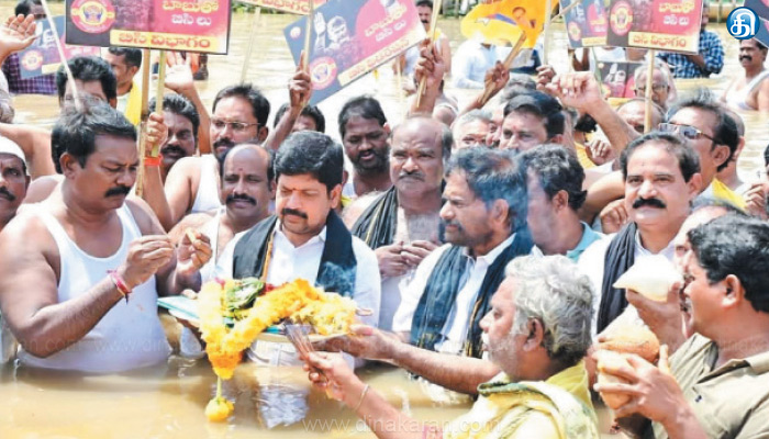 தெலுங்கு தேசம் கட்சி தலைவரும் ஆந்திர மாநில முன்னாள் முதல்வருமான சந்திரபாபு கைது செய்யப்பட்டு சிறையில் அடைக்கப்பட்டுள்ளார். இதை கண்டித்து தெலுங்கு தேசம் கட்சியினர் தொடர் போராட்டங்களில் ஈடுபட்டு வருகின்றனர். இந்த நிலையில் முன்னாள் அமைச்சர் கொள்ளு ரவீந்திரா, தேவிநேனி உமாமகேஸ்வர ராவ், மாநில பிசி பிரிவு தலைவர்கள் நேற்று ஜல தீட்சை மேற்கொண்டனர். அதன்படி ஆற்றில் தண்ணீரில் இறங்கி நின்று பூஜை செய்து நூதன போராட்டத்தில் ஈடுபட்டனர்.