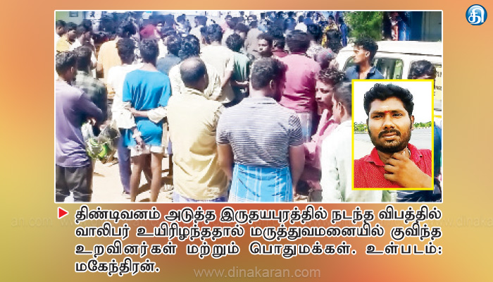 இதில் பலத்த காயமடைந்த மகேந்திரன் சம்பவ இடத்திலேயே உயிரிழந்தார். மேலும் மகேந்திரனின் உடல் சாலையிலேயே கிடந்த நிலையில், 108 ஆம்புலன்சில் ஏற்றாததால் ஆத்திரமடைந்த உறவினர்கள் மற்றும் பொதுமக்கள் திண்டிவனம்-செஞ்சி சாலையில் மறியல் போராட்டத்தில் ஈடுபட்டனர்.
