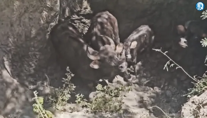 நேற்று காலை தோட்டத்திற்கு வந்த வீரன், காட்டுமாடுகள் கிணற்றில் விழுந்திருப்பதை கண்டு வனத்துறையினருக்கு தகவல் தெரிவித்தார். அதன்பேரில் சம்பவ இடத்திற்கு வந்த வனத்துறையினர் ஜேசிபி இயந்திரத்தை வரவழைத்து காட்டு மாடுகள் மேலே ஏறி வர ஏதுவாக கிணற்றின் ஒருபக்க மண்ணை சரித்து விட்டனர். அதன்பின் 5 காட்டுமாடுகளும் அதன் மீது ஏறி மேலே வந்து காட்டுக்குள் சென்றன. கிணற்றில் தவறி விழுந்ததில் 2 காட்டு மாடுகளின் உடலில் காயங்கள் இருந்ததாக வனத்துறையினர் தெரிவித்தனர்.