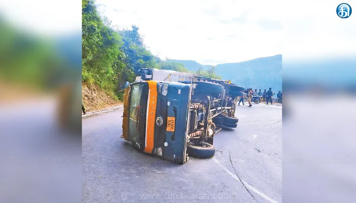 இந்த மலைப்பாதை வழியாக இரு மாநிலங்களுக்கிடையே வாகன போக்குவரத்து நடைபெற்று வருகிறது. இதற்கிடையே இன்று காலை கர்நாடக மாநிலம் குண்டல்பேட்டையில் இருந்து மக்காச்சோளம் பாரம் ஏற்றிய லாரி திருப்பூர் மாவட்டம் உடுமலைப்பேட்டை செல்வதற்காக திம்பம் மலைப்பாதை வழியாக சென்று கொண்டிருந்தது. பதினைந்தாவது கொண்டை ஊசி வளைவு அருகே லாரி திரும்பிய போது டிரைவரின் கட்டுப்பாட்டை இழந்து சாலையின் நடுவே கவிழ்ந்து விபத்து உள்ளானது. இதில் லாரி டிரைவர் லேசான காயங்களுடன் அதிர்ஷ்டவசமாக உயிர் தப்பினார்.