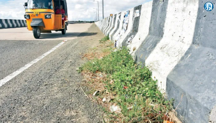இதனால், காற்றின் வேகத்தில் லாரியில் ஏற்றிச் செல்லும் ஜல்லி மற்றும் எம்-சான்ட் கீழே கொட்டி அவை மண், ஜல்லி குவியலாக பாலத்தில் காட்சியளிக்கிறது. இதனால், பாலத்தின் மீது வேகமாக செல்லும் பைக் உள்ளிட்ட வாகனங்கள் இந்த மண், ஜல்லி குவியல்களில் சிக்கி விபத்துக்கள் ஏற்படுகிறது. எனவே, நெடுஞ்சாலைத்துறை அதிகாரிகள் நேரில் வந்து ஆய்வு செய்து பாலத்தின் மீது முளைத்துள்ள செடி, கொடிகள், மரக்கன்றுகளையும், மண் மற்றும் ஜல்லி குவியல்களையும் அகற்ற உரிய நடவடிக்கை எடுக்க வேண்டுமென்று வாகன ஓட்டிகளும், சமூக ஆர்வலர்களும் கோரிக்கை விடுத்துள்ளனர்.