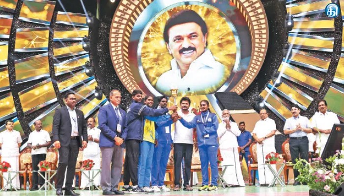 வண்ணமயமான கலை நிகழ்ச்சிகளும் நடத்தப்பட்டன. அமைச்சர்கள் ரகுபதி, பெரியகருப்பன், செந்தில் பாலாஜி, மா.சுப்ரமணியன், மூர்த்தி, சேகர் பாபு, சி.வி.கணேசன், மத்திய சென்னை நாடாளுமன்ற உறுப்பினர் தயாநிதி மாறன், சென்னை மேயர் பிரியா, விளையாட்டுத் துறை செயலர் அதுல்ய மிஸ்ரா, எஸ்டிஏடி உறுப்பினர் செயலாளர் மேகநாத ரெட்டி ஆகியோர் பங்கேற்றனர். நிகழ்ச்சியில் துணை முதலமைச்சர் உதயநிதி ஸ்டாலின் பேசியதாவது: