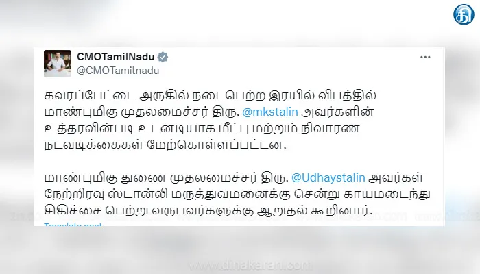 சென்னை: தமிழ்நாடு முதல்வர் மு.க.ஸ்டாலின் வெளியிட்டுள்ள சமூக வலைத்தளப் பதிவு: திருவள்ளூர் மாவட்டம் கவரைப்பேட்டையில் ரயில் விபத்து நடந்ததை அறிந்து அதிர்ச்சியடைந்தேன். தகவல் கிடைக்கப்பெற்றவுடன், அமைச்சர் சா.மு.நாசர் மற்றும் மாவட்ட ஆட்சியர் உள்ளிட்ட அரசு அதிகாரிகளை விபத்து நடந்த இடத்திற்கு செல்ல உத்தரவிட்டேன். மீட்பு மற்றும் உதவிப் பணிகளில் அரசு துரிதமாகச் செயல்பட்டு வருகிறது.