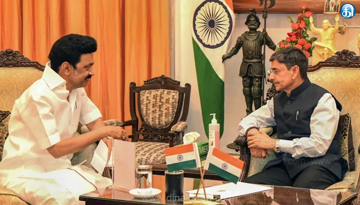 சென்னை: ஆளுநரை ஒன்றிய அரசு உடனே திரும்பப் பெற வேண்டும் என முதலமைச்சர் மு.க.ஸ்டாலின் வலியுறுத்தல் வலியுறுத்தியுள்ளார். சென்னை டிடி தமிழ் டிவியில் நடைபெற்று வரும் இந்தி மாத கொண்டாட்ட விழாவின்போது தமிழ்த் தாய் வாழ்த்தில் அவமதிப்பு செய்யப்பட்டது பெரும் பரபரப்பை ஏற்படுத்தியுள்ளது. தெக்கணமும் அதிற்சிறந்த திராவிடநல் திருநாடும் என்ற வரியை தவிர்த்துவிட்டு பாடியதால் சர்ச்சை ஏற்பட்டுள்ளது. ஆளுநர் ஆர்.என்.ரவி பங்கேற்ற விழாவில் தமிழ்த்தாய் வாழ்த்து பாடப்பட்டபோது திராவிடநல் திருநாடு என்ற வாசகம் தவிர்க்கப்பட்டுள்ளது.