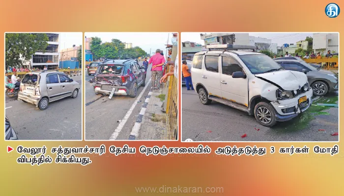 இதனால் அப்பகுதியில் சிறிது நேரம் போக்குவரத்து பாதிக்கப்பட்டது. தொடர்ந்து தகவல் அறிந்த சத்துவாச்சாரி போலீசார் சம்பவ இடத்திற்கு வந்து விசாரணை மேற்கொண்டனர். மேலும் விபத்தில் சிக்கிய 3 கார்களை மீட்டு காவல் நிலையத்திற்கு கொண்டு சென்று விசாரணை நடத்தி வருகின்றனர். இந்த சம்பவம் அந்த பகுதியில் பரபரப்பை ஏற்படுத்தியது.