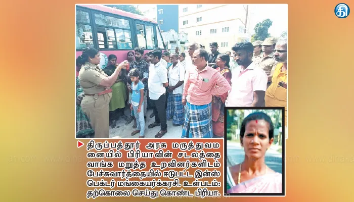 தகவலின் பெயரில் சம்பவ இடத்திற்கு வந்த இன்ஸ்பெக்டர் மங்கையர்கரசி மற்றும் போலீசார் இறந்தவரின் சடலத்தை மீட்டு பிரயோத பரிசோதனைக்கு திருப்பத்தூர் அரசு மருத்துவமனைக்கு அனுப்பி வைத்தனர். பின்னர் இதுகுறித்து பிரியாவின் கணவர் குமரேசனுக்கு தகவல் தெரிவிக்கப்பட்டு நேற்று சொந்த ஊர் திரும்பினார். அப்போது அரசு மருத்துவமனைக்கு வந்தபோது கள்ள தொடர்பு காரணமாக மன உளைச்சலில் தற்கொலை செய்து கொண்டதாக கணவனை கைது செய்யக் கோரியும், இரண்டு பிள்ளைகளுக்கு நியாயம் வழங்க வேண்டும் எனவும் பெண்ணின் குடும்பத்தார் சடலத்தை வாங்க மறுத்து வாக்குவாதத்தில் ஈடுபட்டனர்.