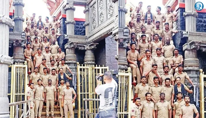 இந்நிலையில் கடந்த சில தினங்களுக்கு முன் தங்களது பணிக்காலம் முடிந்து திரும்பிய 30க்கும் மேற்பட்ட போலீசார் 18ம் படியில் நின்று குரூப் போட்டோ எடுத்த விவகாரம் கேரளாவில் கடும் சர்ச்சையை ஏற்படுத்தியது. போலீசாரின் இந்த நடவடிக்கைக்கு கேரள உயர்நீதிமன்றம் கடும் கண்டனம் தெரிவித்துள்ளது. சபரிமலையில் போலீசாரின் பணி மிகவும் பாராட்டத்தக்கது. ஆனால் 18ம்படி முன் நின்று கொண்டு குரூப் போட்டோ எடுத்ததை ஏற்றுக்கொள்ள முடியாது. எனவே இவர்கள் மீது கடும் நடவடிக்கை எடுக்க வேண்டும் என்று உயர்நீதிமன்றம் தெரிவித்தது.