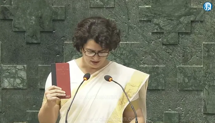 இந்நிலையில், இன்று பிரியங்கா காந்தி நாடாளுமன்ற மக்களவையில் வயநாடு தொகுதி எம்.பி.யாக பதவியேற்று கொண்டார். பிரியங்கா காந்தி கையில் அரசியல் சாசன புத்தகத்தை ஏந்தியபடி பதவியேற்று கொண்டார். அவருக்கு மக்களவை சபாநாயகர் ஓம் பிர்லா பதவிபிரமாணம் செய்து வைத்தார். நாடாளுமன்ற அவையின் முதல் வரிசையில் அமர்ந்திருந்த அண்ணன் ராகுல் காந்தியை, பிரியங்கா காந்தி வணங்கிவிட்டு சென்று பதவிப்பிரமாணம் செய்து கொண்டார்.
