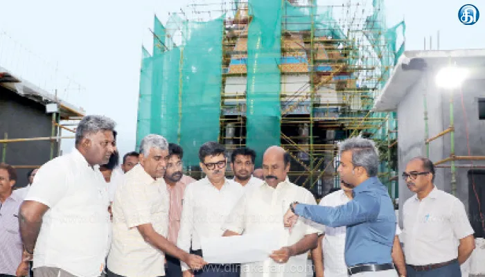 ஆய்வின் போது அமைச்சர் எ.வ.வேலு கூறியதாவது: தோரணவாயில் முகப்பில், அழகு மிளிரச் செய்யும் ஸ்தபதிகளின் பணிகளை பார்வையிட்டு, துரிதமாக முடிக்க வேண்டும். மின் பணிகள் 80 சதவீதம் முடிவடைந்துள்ளது. கலையரங்கம், குறள் மணிமண்டபம், தோரணவாயில் கட்டடங்களில் நடைபெற்று வரும் மின் பணிகளையும் விரைந்து முடிக்க வேண்டும். பல்லடுக்கு வாகன நிறுத்துமிட கூரை கான்கிரீட் போடப்பட்டுள்ளது, கலையரங்கத்தில் பால்ஸ் சீலிங் பணி மற்றும் வால்பேனலிங் பணிகள் நடைபெற்று. இதுவரை மொத்தமாக 75 சதவீதப் பணிகள் நிறைவு பெற்றுவிட்டது. பொது மக்கள், பார்வையாளர்கள், சுற்றுலா பயணிகள் ஆகியோர்களுக்காக ஏற்படுத்தப்பட்ட பல்வேறு வசதிகளை, பொதுப்பணித்துறை பொறியாளர்கள் விரைந்து முடிக்கப்பட வேண்டும் என அறிவுறுத்தினார். ஆய்வின்போது, செயலாளர் மங்கத் ராம் சர்மா, பொதுப்பணித்துறை சென்னை மண்டலத் தலைமைப் பொறியாளர் மணிவண்ணன், சிறப்பு பணி அலுவலர் விஸ்வநாத், கண்காணிப்பு பொறியாளர்கள், செயற்பொறியாளர்கள் மற்றும் இதர அலுவலர்கள் கலந்து கொண்டனர்.