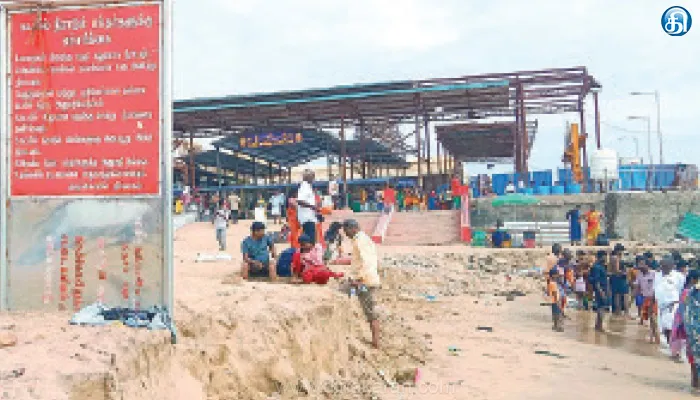 கோயிலில் கிழக்கு கடற்கரைப் பகுதியில் தொடங்கி வடக்கு பகுதி கடற்கரை வரையில் ரூ.19 கோடியே 80 லட்சம் மதிப்பில் 496 மீட்டர் நீளம், 20 மீட்டர் அகலம், 6 மீட்டர் உயரத்தில் 200 மி.மீ. அளவுக்கு குறையாத கருங்கற்கள் மேல் இடைவெளி இல்லாமல் நிரப்பி தடுப்புச் சுவர் அமைக்கப்பட்டு வருகிறது. மீன்வளத் துறையினரால் இந்தப் பணி தற்போது வள்ளிக்குகை பகுதியில் இருந்து கடற்கரை வாசல் வரை இரவு, பகலாக வேகமாக நடந்து வருகிறது. இதேபோல் அய்யா கோயிலை தாண்டி கடற்கரையில் தூண்டில் வளைவு பாலத்திற்காக கடலில் கற்கள் கொட்டப்பட்டு வருகிறது. இதனால் இருபக்கம் கற்கள் கொட்டப்படுவதால் நடுவில் கடலின் சீற்றம் அதிகமாக உள்ளதாக பக்தர்கள் தெரிவிக்கின்றனர்.