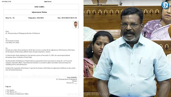 முதலமைச்சர் உடனடித் தேவைகளை நிறைவு செய்வதற்கும், தற்காலிக மறுசீரமைப்புப் பணிகளுக்காகவும், சேதமடைந்த உள்கட்டமைப்பை மீண்டும் கட்டியெழுப்புவதற்காகவும் ஒன்றிய அரசிடம் ரூ. 2,475 கோடி வழங்கும்படிக் கேட்டுள்ளார். இந்தப் பேரழிவின் அளவைக் கருத்தில் கொண்டு, தேசிய முக்கியத்துவம் வாய்ந்த இந்த முக்கியமான பிரச்சினையை விவாதிப்பதற்காக இந்த சபையின் அலுவல்களை ஒத்திவைக்க வேண்டும் என்று நான் வலியுறுத்துகிறேன். என அந்த ஒத்திவைப்புத் தீர்மான நோட்டீஸில் குறிப்பிடப்பட்டுள்ளது. அதே போன்ற நோட்டீஸை விழுப்புரம் நாடாளுமன்ற உறுப்பினர் ரவிக்குமார் அவர்களும் அளித்துள்ளார். இவ்வாறு தெரிவித்தார்.