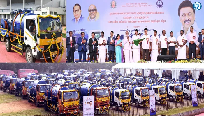 100 நவீன கழிவுநீர் அகற்றும் வாகனங்களுக்கான சாவிகளை தூய்மைப் பணியாளர்களுக்கு வழங்கி, கொடியசைத்து தொடங்கி வைத்தார் முதலமைச்சர் மு.க. ஸ்டாலின்!