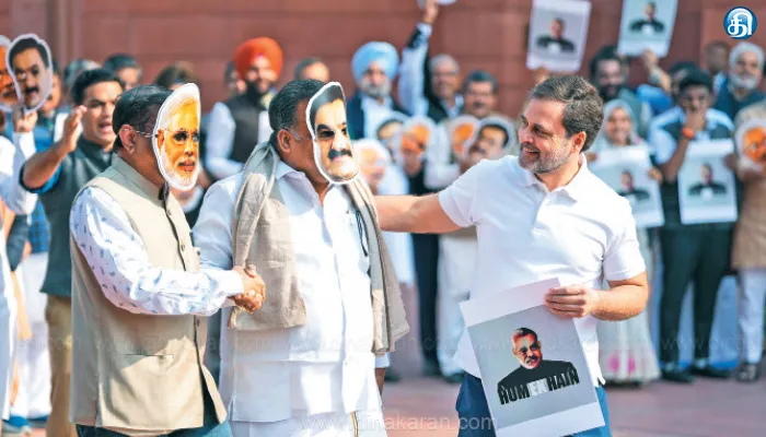 அப்போது ராகுல்,’ மோடி ஏன் மவுனமாக இருக்கிறார்?’ என்று கேள்வி எழுப்ப, அதற்கு அதானி டேமிட்ட எம்பி,’ இந்த நாட்களில் இவர் டென்ஷனில் இருக்கிறார்’ என்று கூறினார். அதை தொடர்ந்து,’ உங்கள் அடுத்த திட்டம் என்ன, இப்போது என்ன வாங்க முடிவு செய்து இருக்கிறீர்கள்’ என்று ராகுல் கேட்டதற்கு, அதானி முகமூடி அணிந்திருந்த காங்கிரஸ் எம்.பி., ‘நாங்கள் இன்னும் முடிவு செய்யவில்லை, இன்று மாலை ஒரு சந்திப்பு உள்ளது’ என்றார். இதில், சப்தகிரி சங்கர் உலாகா பிரதமர் மோடி முகமூடியையும், மாணிக்கம் தாகூர் அதானி முகமூடியையும் அணிந்திருந்தனர். எதிர்க்கட்சி எம்பிக்களின் இந்த போராட்டத்தில் திரிணாமுல் காங்கிரஸ், சமாஜ்வாதி, ஆம் ஆத்மி ஆகிய கட்சிகள் பங்கேற்கவில்லை.