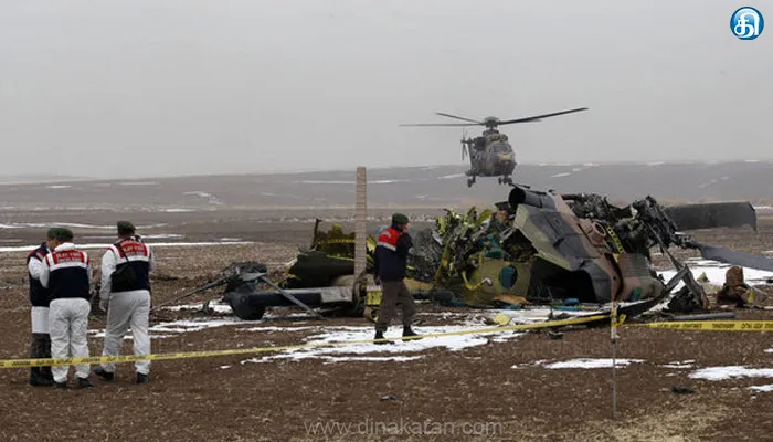 அங்காரா: துருக்கியில் 2 ராணுவ ஹெலிகாப்டர்கள் நடுவானில் மோதியதில் 5 ராணுவ அதிகாரிகள் உயிர் இழந்தனர். துருக்கி நாட்டின் இஸ்பார்ட்டா மாகாணத்தில் நேற்று 2 ராணுவ ஹெலிகாப்டர்கள் பயிற்சியில் ஈடுபட்டன. அப்போது ஹெலிகாப்டர்களும் நடுவானில் மோதின. இதில் ஒரு ஹெலிகாப்டர் நொறுங்கி விழுந்து விபத்துக்குள்ளானது. அதில், இருந்த ராணுவ பிரிகேடியர் ஜெனரல் உட்பட 5 அதிகாரிகள் பரிதாபமாக உயிர் இழந்தனர். ஒருவர் உயிர் தப்பினார். விபத்துக்குள்ளான இன்னொரு ஹெலிகாப்டர் பத்திரமாக தரையிறங்கியது.