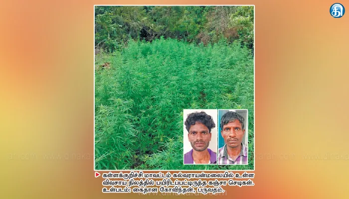 அப்போது முனியன் மகன் பருவதம் (43), பூஞ்சோலை மகன் கோவிந்தன் (32) ஆகியோருக்கு சொந்தமான விவசாய நிலத்தில் கஞ்சா செடிகள் வளர்ப்பது தெரியவந்தது. இதையடுத்து அங்கிருந்து சுமார் 104 கிலோ எடை கொண்ட 21,500 கஞ்சா செடிகளை போலீசார் பறிமுதல் செய்தனர். அவற்றை மூட்டைகளில் எடுத்துச்சென்றனர். தொடர்ந்து கஞ்சா செடி வளர்த்த பருவதம், கோவிந்தன் ஆகிய இருவரையும் கைது செய்து தீவிர விசாரணை நடத்தி வருகின்றனர்.