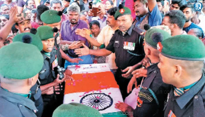 இதில் இன்பராஜா பலியானார். அவரது உடல் சொந்த ஊரான எம்.எஸ்.புரத்திற்கு நேற்று கொண்டு வரப்பட்டது. கலெக்டர் சங்கீதா, எம்எல்ஏ அய்யப்பன் மற்றும் பொதுமக்கள் அஞ்சலி செலுத்தினர். ராணுவத்தினர் மலர் வளையம் வைத்து மரியாதை செலுத்தினர். இதையடுத்து, அவருக்கு சொந்தமான தோட்டத்தில் 24 குண்டுகள் முழங்க ராணுவ மரியாதையுடன் இன்பராஜா உடல் அடக்கம் செய்யப்பட்டது.