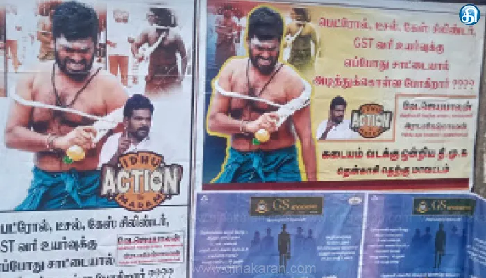 தென்காசி மாவட்டம் கடையம் வடக்கு ஒன்றிய சுற்று வட்டார பகுதியில் திமுக சார்பில் வடக்கு ஒன்றிய திமுக செயலாளர் மகேஷ் மாயவன் என குறிப்பிட்டு பாஜ தலைவர் அண்ணாமலை சாட்டையால் அடித்துக் கொள்ளும் படத்துடன் ஒட்டப்பட்டுள்ள போஸ்டர்களில், பெட்ரோல், டீசல், கேஸ் சிலிண்டர், GST வரி உயர்வு போன்றவைகளுக்கு எப்போது சாட்டையால் அடித்துக் கொள்ளப் போகிறார்? என கேள்வி எழுப்பப்பட்டுள்ளது. ஒன்றிய அரசின் பெட்ரோல், டீசல் விலை உயர்வு, கேஸ் விலை உயர்வு, ஜிஎஸ்டி ஆகியவற்றை குறிப்பிட்டு ஒட்டப்பட்டுள்ள போஸ்டர்கள் தென்காசி மாவட்டத்தில் பரபரப்பாக பேசப்பட்டு வருகிறது.