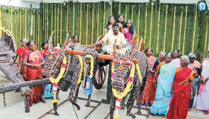 அந்த வகையில், இந்தாண்டு விவசாயத்தையும், அழிந்து வரும் காளை மாடுகளையும், மாட்டு வண்டிகளையும் கவுரவித்து இளைய தலைமுறையினரிடையே விழிப்புணர்வை ஏற்படுத்தும் வகையில் கடந்த ஒரு வாரமாக 3 டன் எடையுள்ள செங்கரும்பில் மாட்டு வண்டி, 5 அடி உயரமுள்ள 2 காளை மாடுகளை உருவாக்கி வண்டியில் பூட்டி மாட்டு பொங்கலை பாரம்பரிய முறைப்படி விவசாய குடும்பத்தினர் கொண்டாடி மகிழ்ந்தனர். செங்கரும்பிலான மாட்டு வண்டி, காளை மாடுகள் அமைத்து விவசாய குடும்பத்தினர் வணங்குவதையறிந்ததும் அந்த பகுதி மக்கள் ஆச்சரியத்துடன் பார்த்து ரசித்து செல்கின்றனர்.