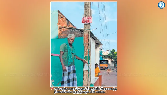 இந்நிலையில் சாம்பவர் வடகரை 5வது வார்டு பெத்த பெருமாள்தெரு, அம்மன் கோயில் வடபுறம் உள்ள மின்கம்பங்கள் உடைந்து கீழே விழும் நிலையில் உள்ளது. மின்கம்பங்களை பொதுமக்கள் கயிறு கட்டி வைத்துள்ளனர். உயிர் பலி வாங்க காத்திருக்கும் மின்கம்பங்களை அகற்ற வேண்டும் என்று மின்வாரிய அதிகாரிகளிடம் பல முறை பொதுமக்கள் கோரிக்கை விடுத்தும் நடவடிக்கை எடுக்கவில்லை என புகார் தெரிவித்தனர்.