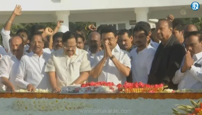 இதனை தொடர்ந்து அண்ணா நினைவிடத்தில் முதல்வர் மு.க.ஸ்டாலின் மரியாதை செலுத்தினார். இந்த பேரணியில் துணை முதல்வர் உதயநிதிஸ்டாலின், அமைச்சர் துரைமுருகன் உள்ளிட்ட அமைச்சர்கள், திமுக நாடாளுமன்ற உறுப்பினர்கள், சட்டமன்ற உறுப்பினர்கள், திமுக நிர்வாகிகள் பலர் கலந்து கொண்டனர்.