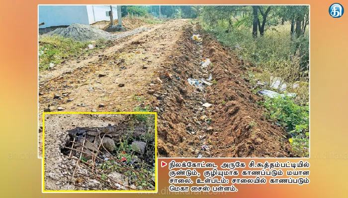 கடந்த 5 மாதங்களுக்கு முன்பு நிலக்கோட்டை ஊராட்சி ஒன்றிய பொது நிதியிலிருந்து ரூ.15 லட்சம் மதிப்பீட்டில் மயான சாலையை சீரமைக்க ஒப்பந்தம் விடப்பட்டது. இதையொட்டி ஜேசிபி மூலம் சாலையை தோண்டி முதற்கட்ட பணி துவங்கப்பட்டது.