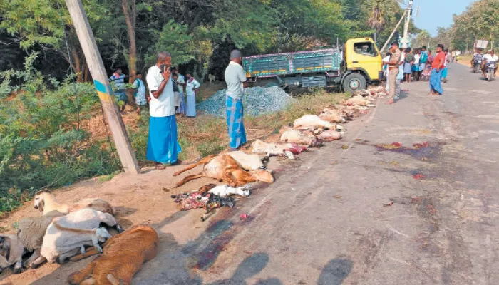 அப்போது அவ்வழியாக கடலூர் மாவட்டம் கொரக்கவாடி காட்டுக்கொட்டகை பகுதியை சேர்ந்த ஓட்டுநர், லட்சுமணன் மகன் கார்த்திக்(28) என்பவர் மினி லாரியை ஓட்டி வந்துள்ளார். அப்போது ஓட்டுனரின் கட்டுப்பாட்டை இழந்த மினி லாரி சாலையில் சென்ற செம்மரி ஆடுகள் மீது மோதியது. இதில் 30 ஆடுகள் மினி லாரியில் சிக்கி உடல் நசுங்கி சம்பவ இடத்திலேயே இறந்தன. இதுகுறித்து தகவலின் பேரில், சம்பவ இடத்திற்கு சென்ற ராமநத்தம் போலீசார் வழக்கு பதிவு செய்து ஓட்டுனர் கார்த்திக்கை கைது செய்தனர். மேலும் ஆடுகளின் உரிமையாளர் ஆடுகள் இறந்து கிடப்பதை பார்த்து கதறி அழுத சம்பவம் அங்கு இறந்தவர்கள் மத்தியில் சோகத்தை ஏற்படுத்தியது.