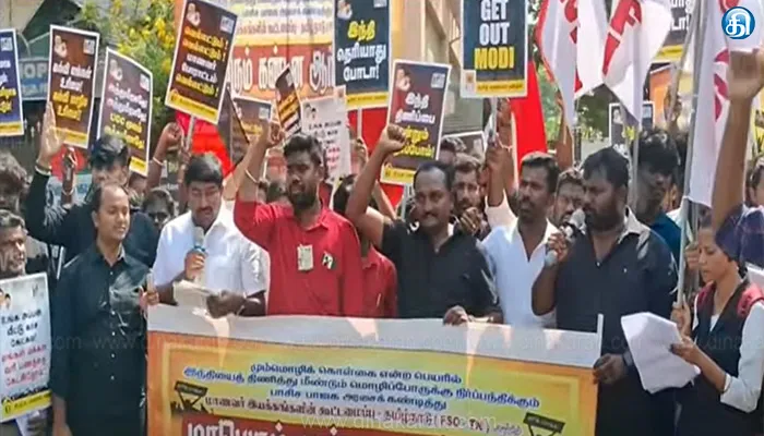மதுரை மாவட்ட ஆட்சியர் அலுவலகம் அருகே திமுக மாணவரணி மற்றும் மாணவர் இயக்கங்களின் கூட்டமைப்பு சார்பில் நடைபெற்ற ஆர்ப்பாட்டத்தில் பங்கேற்றவர்கள் ஒன்றிய அரசின் இந்தி திணிப்பு முயற்சி கூட்டாட்சி தத்துவத்துக்கு எதிரானது என்று குற்றம் சாட்டினர். புதுக்கோட்டையில் ஊர்வலமாக சென்ற திமுக மாணவரணி மற்றும் மாணவர் அமைப்பினர் தலைமை அஞ்சலகத்தை முற்றுகையிட்டு போராட்டத்தில் ஈடுபட்டனர். நாமக்கல் பிஎஸ்என்எல் அலுவலகம் முன்பு நடைபெற்ற இந்தி திணிப்புக்கு எதிரான ஆர்ப்பாட்டத்தில் பங்கேற்ற மாணவ கூட்டமைப்பினர் ஒன்றிய அரசின் இந்தி திணிப்பு முயற்சிக்கு தங்கள் கண்டனத்தை பதிவு செய்தனர்.