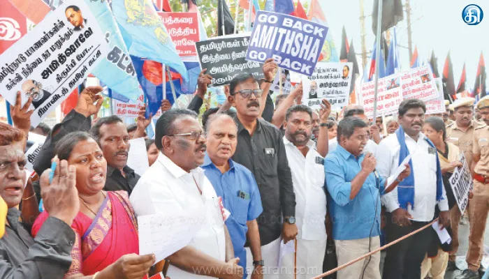 ஏராளமானோர் பங்கேற்று ‘கோ பேக் அமித்ஷா’ என கோஷம் எழுப்பினர். தொண்டர்கள் கருப்புச்சட்டை அணிந்து, கருப்பு பலூன் பறக்கவிட்டனர். இதேபோல கோவை-அவிநாசி சாலையில் உள்ள தனியார் தொழில்நுட்ப கல்லூரி அருகே பல்வேறு அமைப்புகள் சார்பில் கருப்புக்கொடி போராட்டம் நடைபெற்றது. தபெதிக பொதுச்செயலாளர் கு.ராமகிருட்டிணன் தலைமையில் நடைபெற்ற இந்த போராட்டத்தில், திக, இந்திய கம்யூனிஸ்ட், விசிக, ஆதித்தமிழர் பேரவை, தமிழ்ப்புலிகள் கட்சி உள்ளிட்ட பல்வேறு அமைப்புகளை சேர்ந்தவர்கள் கலந்து கொண்டனர்.