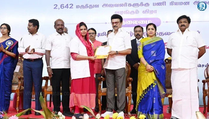 சென்னை: தமிழ்நாடு முதல்வர் மு.க.ஸ்டாலின் நேற்று சென்னை, திருவான்மியூரில் மருத்துவம் மற்றும் மக்கள் நல்வாழ்வுத் துறை சார்பில் நடைபெற்ற நிகழ்ச்சியில், தமிழ்நாடு மருத்துவப் பணியாளர் தேர்வு வாரியத்தின் மூலமாக தேர்வு செய்யப்பட்ட 2,642 மருத்துவ அலுவலர்களுக்கு பணி நியமன ஆணைகளை வழங்கிடும் அடையாளமாக 25 பேருக்கு பணி நியமன ஆணைகளை வழங்கினார்.