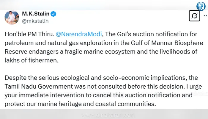 சென்னை: தமிழ்நாட்டின் கடற்கரையோரத்தில், மன்னார் வளைகுடா கடல் பகுதியில் மீனவர்களின் வாழ்வாதாரம் பாதிக்கும் வகையில் கடல்சார் ஆழ்துளை எரிவாயு கிணறுகள் அமைக்கும் நடவடிக்கையை கைவிட வலியுறுத்தி பிரதமருக்கு முதல்வர் மு.க.ஸ்டாலின் கடிதம் எழுதியுள்ளார். இதுகுறித்து பிரதமர் மோடிக்கு முதல்வர் மு.க.ஸ்டாலின் நேற்று எழுதியுள்ள கடிதத்தில் கூறி இருப்பதாவது: தமிழ்நாட்டின் கடற்கரையோரத்தில், மன்னார் வளைகுடா கடல் பகுதியில் ஒன்றிய அரசு மேற்கொண்டிருக்கும் கடல்சார் ஆழ்துளை எரிவாயு கிணறுகள் அமைக்கும் நடவடிக்கை குறித்து தனது ஆழ்ந்த கவலையை தெரிவித்துக் கொள்கிறேன். ஒன்றிய அரசின் பெட்ரோலியம் மற்றும் இயற்கை எரிவாயு அமைச்சகத்தின் ஹைட்ரோகார்பன் இயக்குநரகம், பெட்ரோலியம் மற்றும் இயற்கை எரிவாயு தொகுதிகளை ஏலம் விடுவதற்கான திறந்தவெளி பரப்புரிமை கொள்கை அறிவிப்பினை 11.02.2025 அன்று தொடங்கி இருப்பதாகவும், அந்த அறிவிப்பில் காவிரி படுகையில் CY-DWHP-2024/1 என்ற தொகுதி பெயரில் 9990.96 சதுர கி.மீ. பரப்பளவும் அடங்கும்.