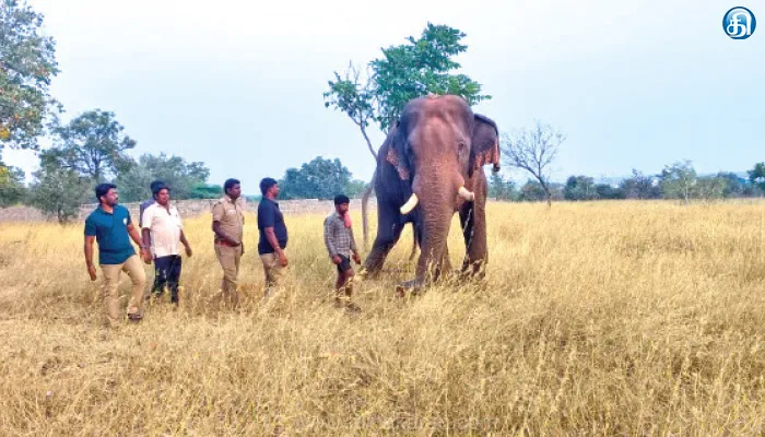 தடாகம் சுற்று வட்டார பகுதிகளில் காட்டு யானையாக உலா வந்த சின்னத்தம்பி யானையின் சேட்டைகள் மற்றும் குறும்புத்தனமான நடவடிக்கைகளால் அப்பகுதி மக்களிடம் பிரபலமாக இருந்தது. விளைநிலங்களை சேதப்படுவத்துவதாக எழுந்த புகாரின் பேரில் கடந்த 2019ம் ஆண்டு வனத்துறையினர் மயக்க ஊசி செலுத்தி பிடிக்கப்பட்ட சின்னத்தம்பி யானை, டாப்சிலிப் யானைகள் முகாமிற்கு கொண்டு செல்லப்பட்டு கும்கி யானையாக மாற்றப்பட்டது. இதையடுத்து கிராமங்களுக்குள் நுழையும் காட்டு யானைகளை விரட்ட சின்னத்தம்பி யானை பயன்படுத்தப்பட்டு வருகிறது. இதனிடையே 6 ஆண்டுகளுக்கு பிறகு சின்னத்தம்பி யானை தனது சொந்த மண்ணிற்கு காட்டு யானையை விரட்ட அழைத்து வரப்பட்டது. இதனை அறிந்த அப்பகுதி மக்கள் அந்த யானையை ஆர்வத்துடன் சென்று பார்வையிட்டனர்.