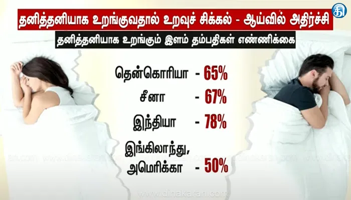 தனித்தனியாக உறங்கும் இளம் தம்பதிகள் தென்கொரியாவில் – 65%மும், சீனாவில் – 67%ஆகவும் உள்ள நிலையில், இந்தியாவில் – 78% இளம் தம்பதிகள் தனித்தனியாக உறங்குவதாக ஆய்வு முடிவுகள் தெரிவிக்கின்றன. இங்கிலாந்து மற்றும் அமெரிக்காவில் – 50% இளம் தம்பதிகள் தனித்தனியாகவும், ஒன்றாக சேர்ந்தும் உறங்குகின்றனர். தம்பதிகள் தனியாக உறங்குவது அதிர்ச்சிக்குரியதாக இருந்தாலும், ஆழ்ந்த உறக்கத்திற்கு அது உதவுவதாக சிலர் தெரிவிக்கின்றனர்.